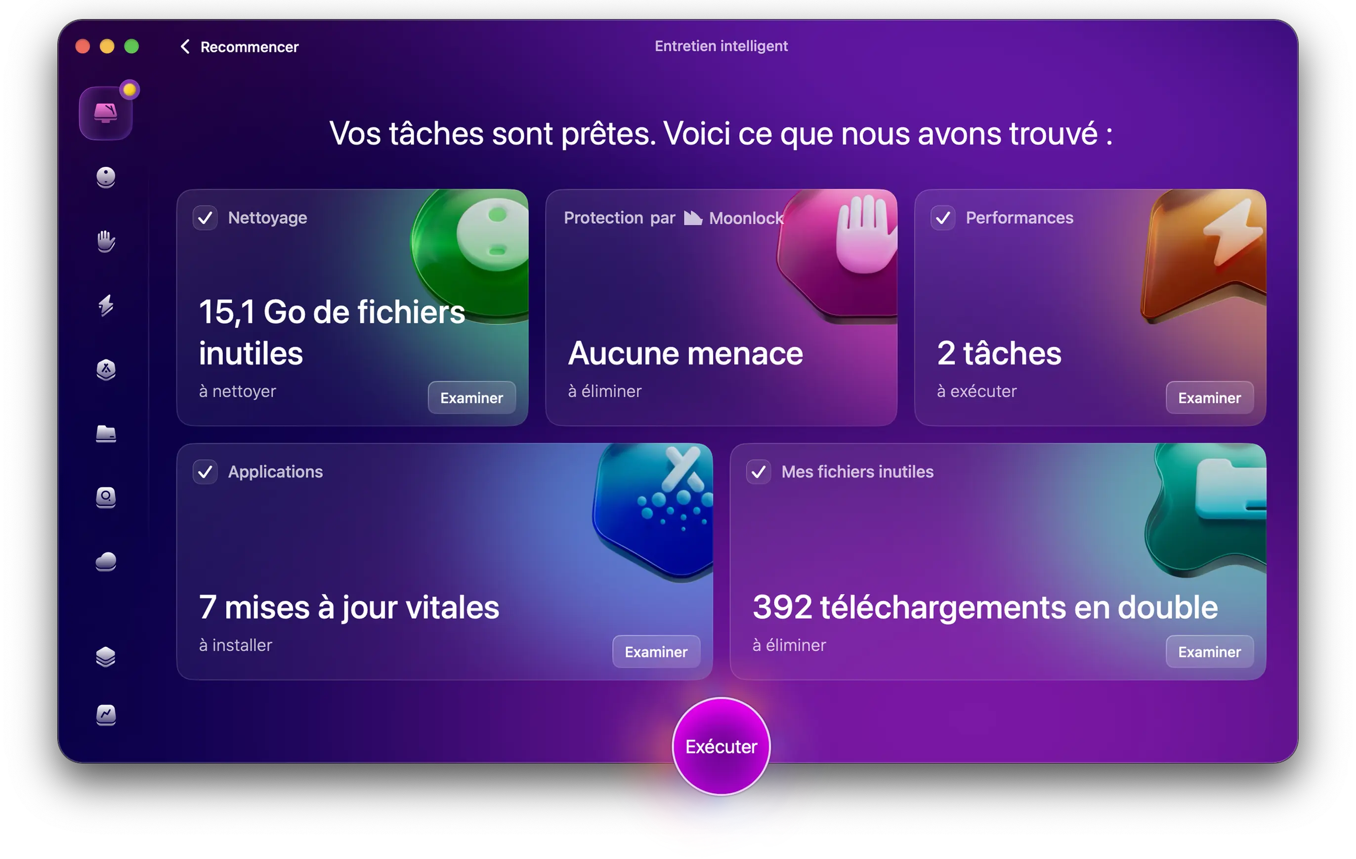 Entretien intelligent vous permet de faire un bilan complet de votre Mac. Il génère une liste de nettoyage personnalisée montrant les fichiers inutiles et les tâches d'optimisation que vous pouvez exécuter.