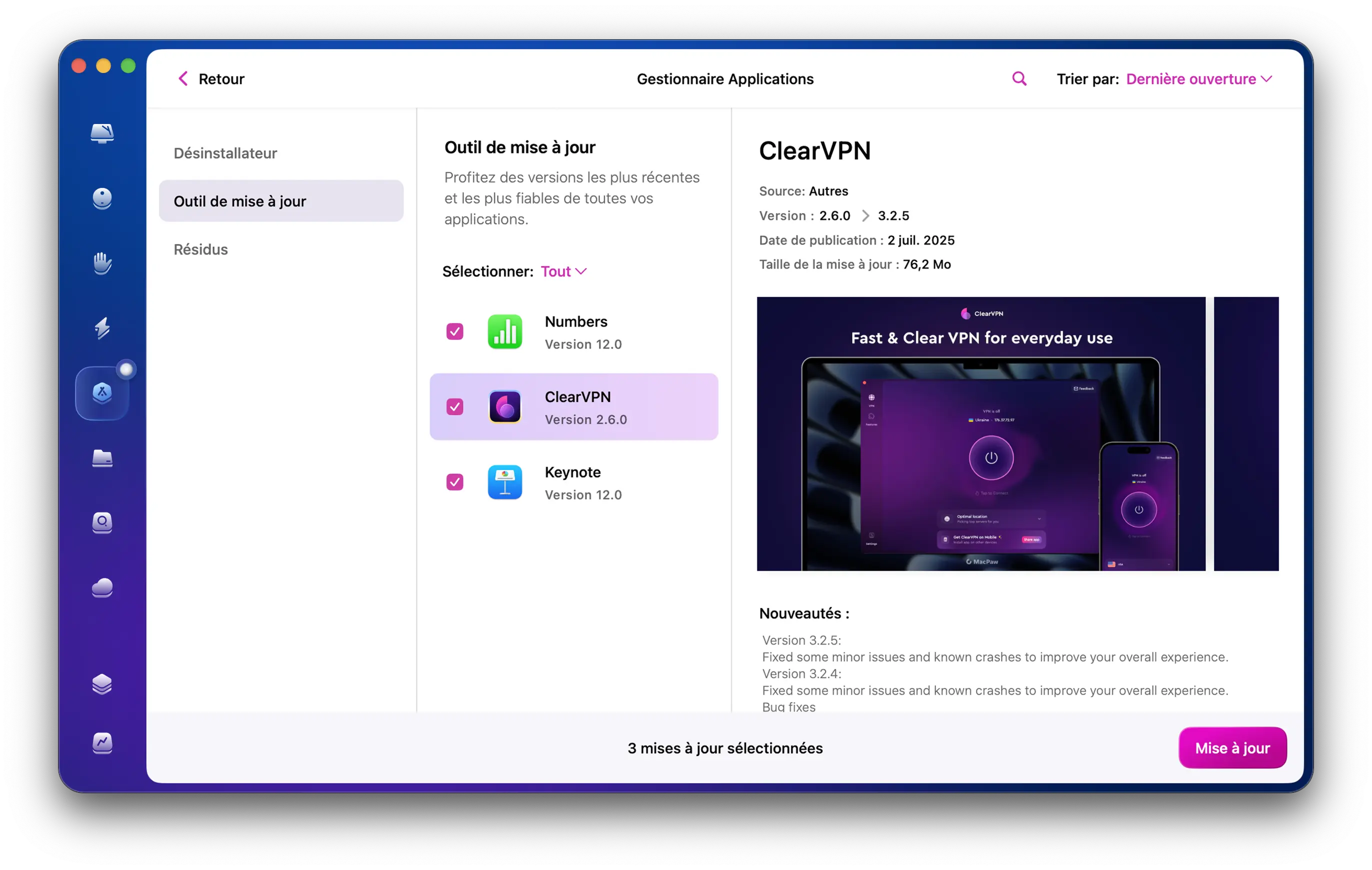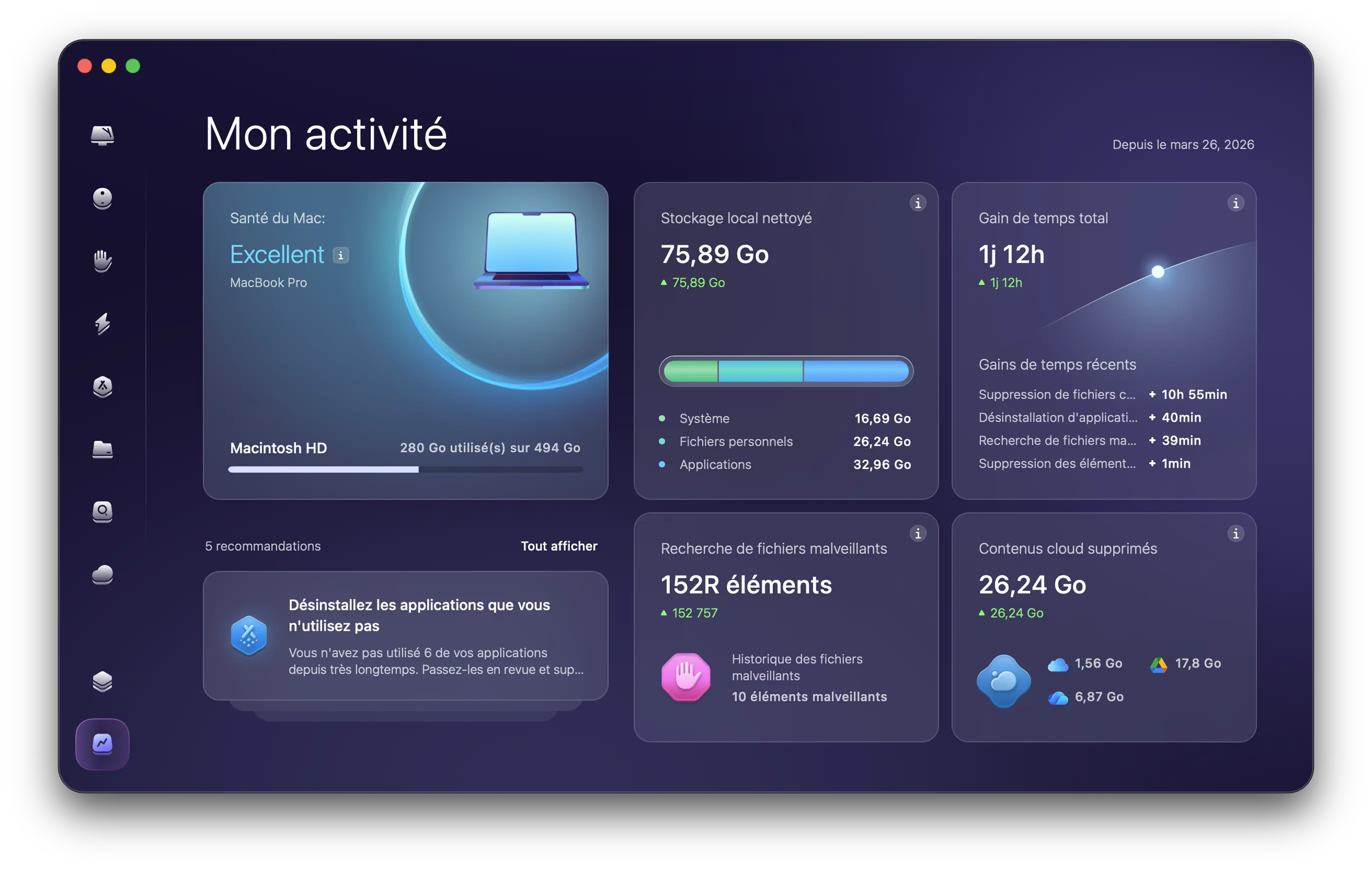 CleanMyMac remplace des dizaines d'outils d'optimisation pour Mac. Vous voulez mettre de l'ordre rapidement dans vos documents ? Vous vous demandez ce qui consomme de la mémoire ? Vous voulez enlever des logiciels publicitaires de votre navigateur ? La solution : notre application !