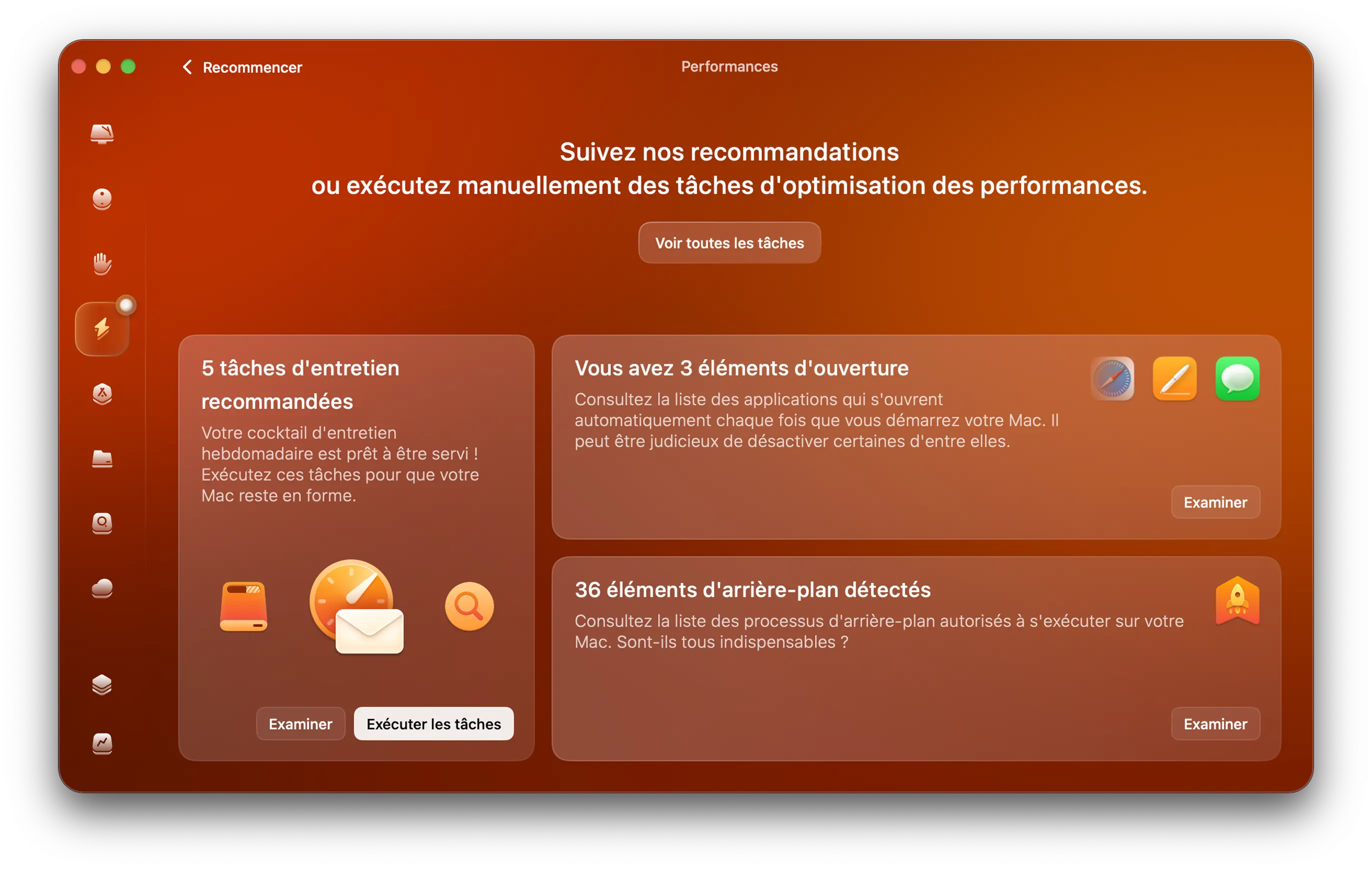 Lorsque votre Mac ralentit, vous avez à votre disposition un arsenal complet d'outils d'accélération : libérez de la RAM, exécutez des scripts de maintenance et faites du tri dans les éléments d'ouverture et les applications d'arrière-plan. Vous laisserez ainsi votre Mac souffler un peu et pourrez optimiser ses performances.