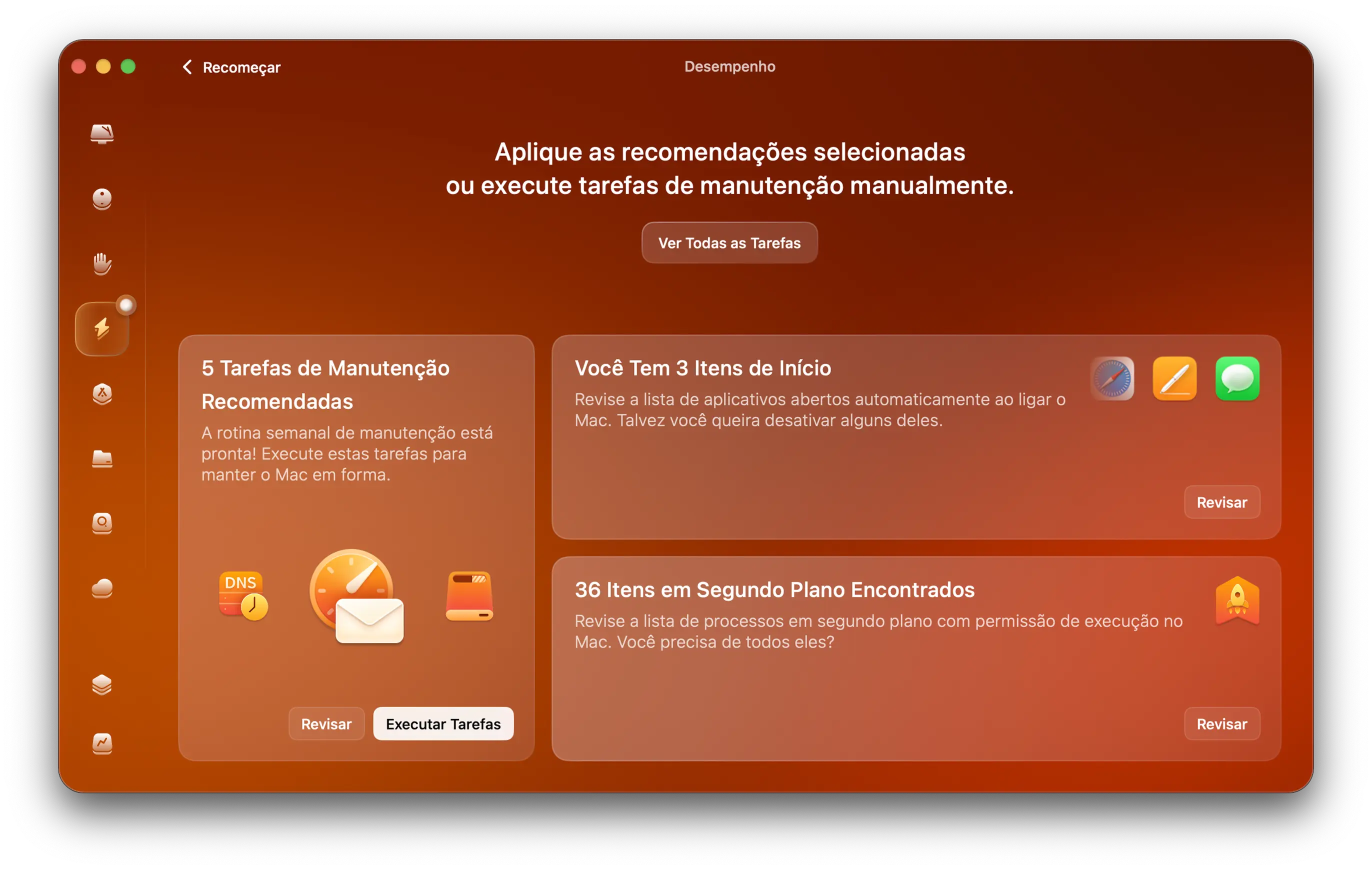 Sempre que o Mac engasgar, conte com um arsenal de ferramentas de aceleração: libere a RAM, execute scripts de manutenção, e gerencie itens de início e apps em segundo plano. Assim, você diminui a carga do sistema e ajusta o desempenho do Mac ao máximo.
