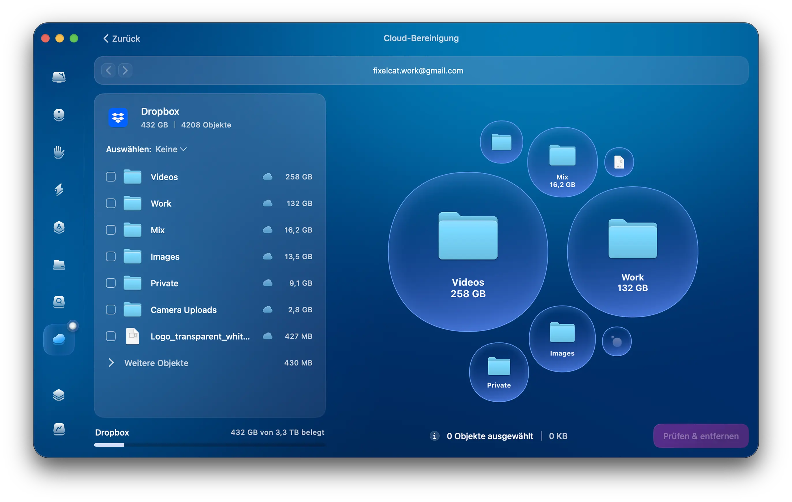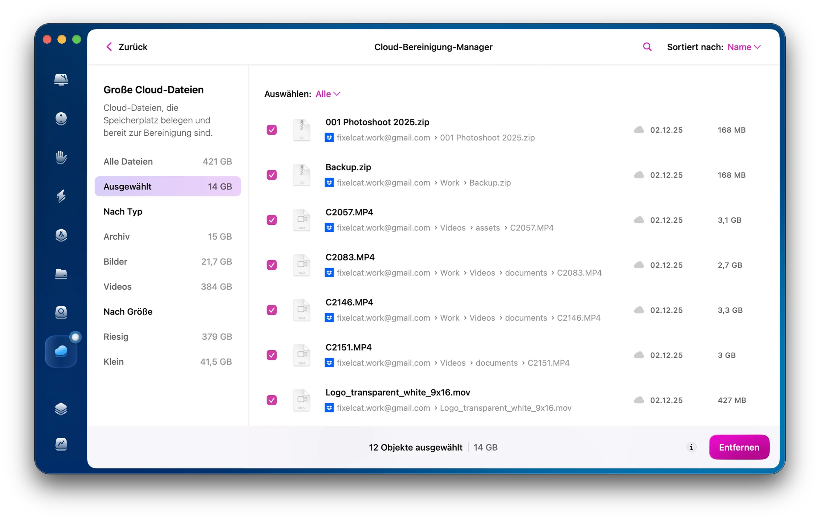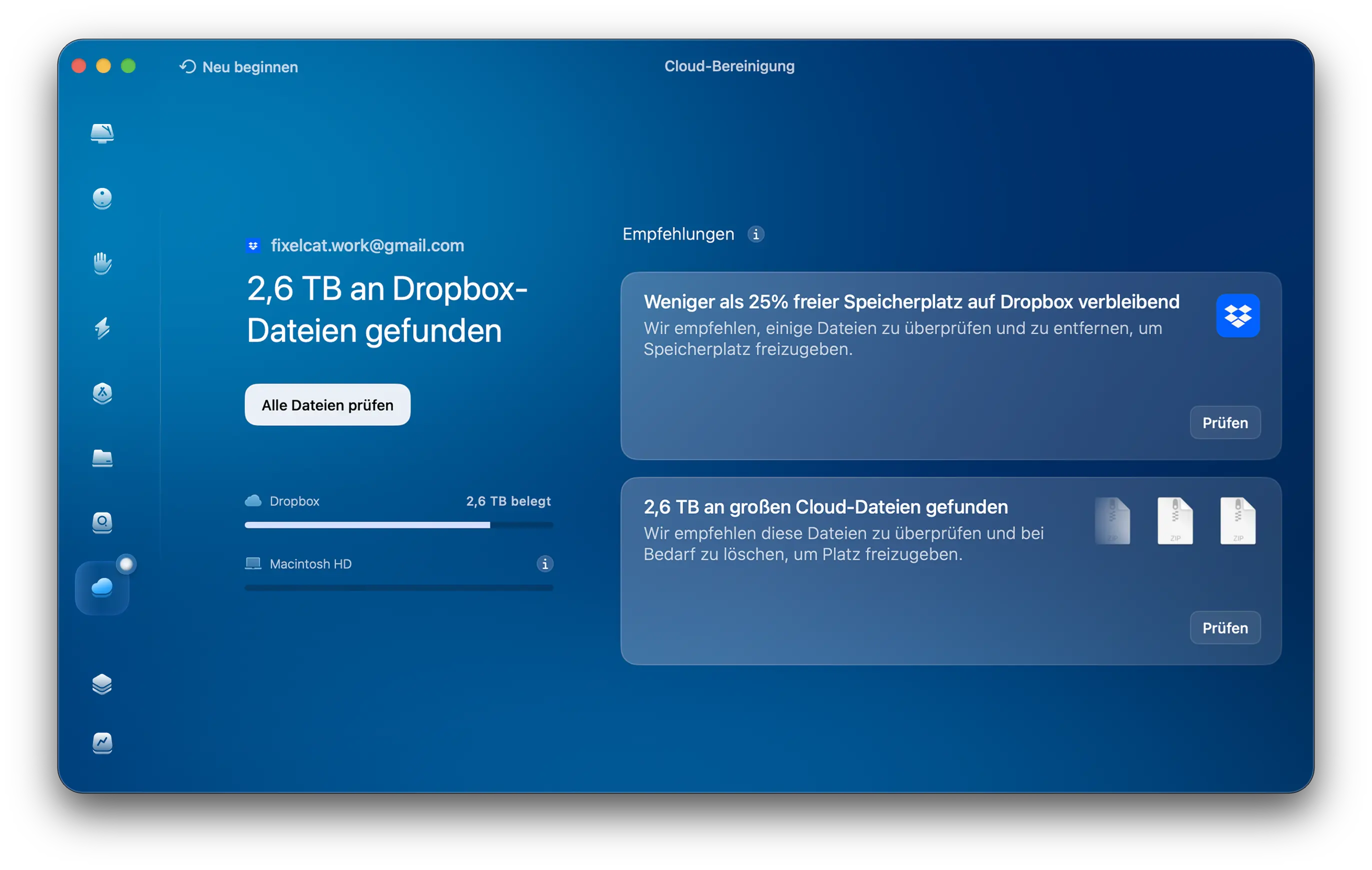 Cloud-Bereinigung ist CleanMyMacs Tool für digitale Sammler. Es zeigt eine vollständige Zusammenfassung Ihrer Dateien und gibt Ihnen den kleinen Schub, um endlich mit dem Aufräumen zu beginnen