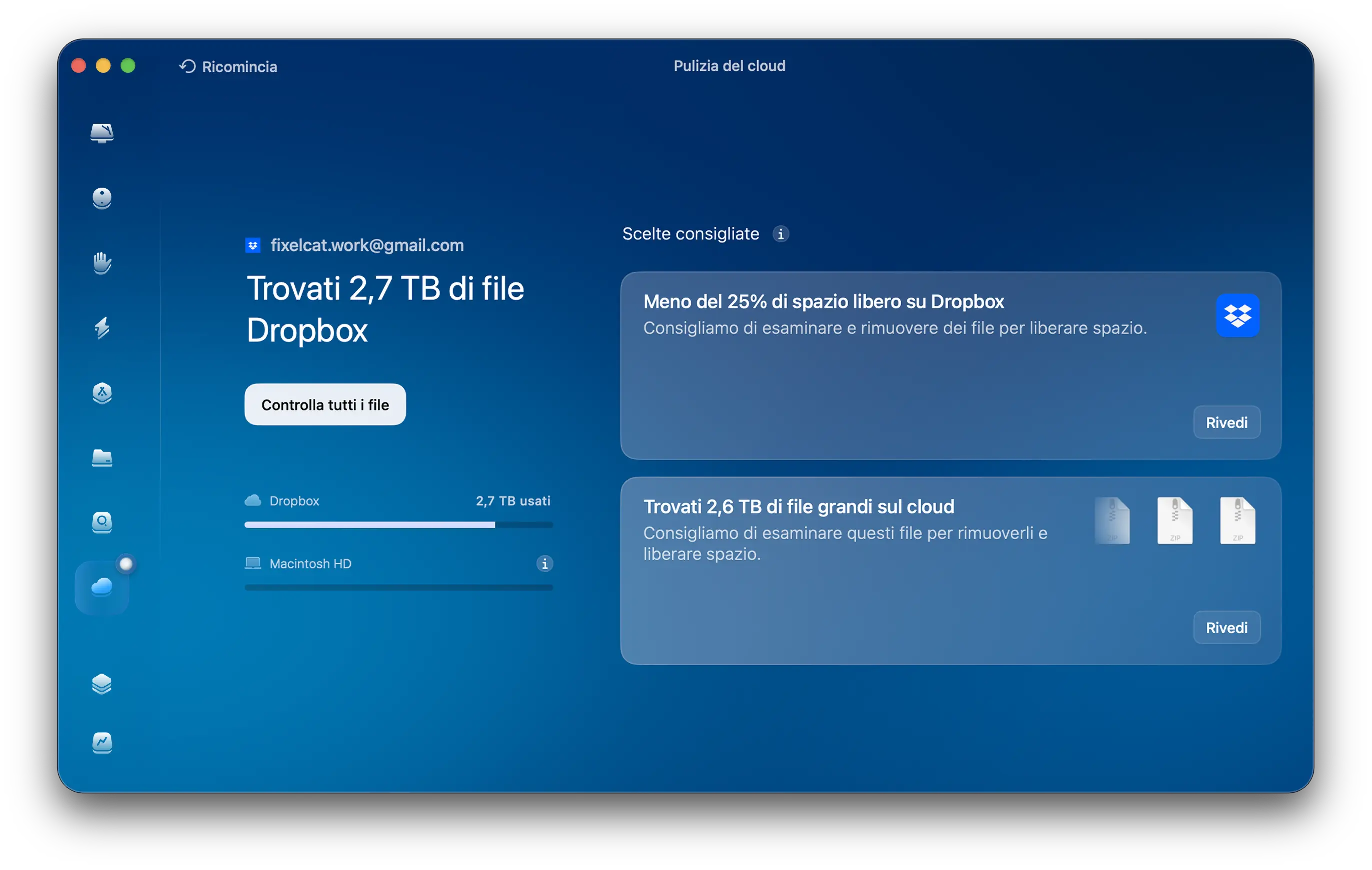 Pulizia del cloud è lo strumento di CleanMyMac per gli accumulatori digitali. Mostra un riepilogo completo dei tuoi file e ti dà quella piccola spinta per iniziare finalmente a riordinare